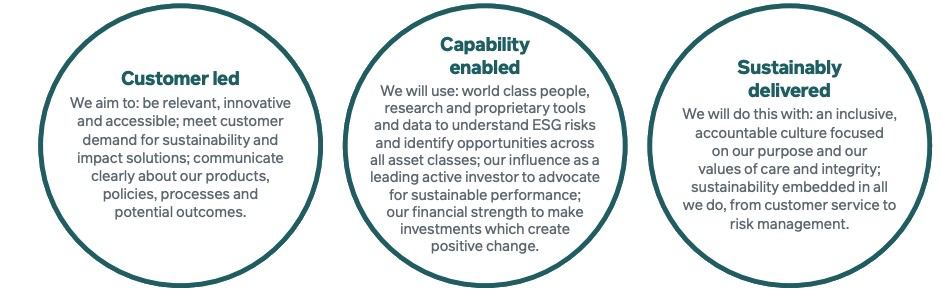 As an asset manager, we must aim to deliver the financial outcomes and any sustainability requirements set out in the objectives of each of our mutual funds, or in the mandates we receive from institutional clients. Sometimes there may be differences in the sustainability criteria that external clients mandate, and in turn these may differ from the requirements of our internal client. While our values of care and integrity inform all our sustainability work, the asset manager and asset owner are separately regulated businesses with independent Boards and governance processes, and their policies may diverge on occasion.